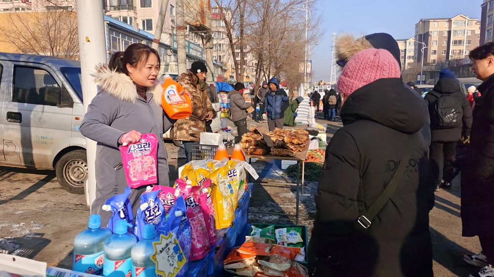 記者在依蘭鎮(zhèn)興安大集看到,每日隆便利店參花街北店精選了50余種民生、年貨商品進行低價促銷,有米面糧油、飲料酒水、冷凍食品、生活用品、春節(jié)禮盒等。“我們從早上6點就開始出攤,因為商品符合年貨需求,且優(yōu)惠力度空前,受到許多消費者的歡迎。其中,辛拉面、速凍餃子、柔順劑等產品銷售情況特別好。”每日隆便利店參花街北店店長張彥春告訴記者,店里還推出滿額贈禮活動,購物滿98元贈送價值15元的紙面巾,購物滿168元贈送價值37.5元的洗衣液。
