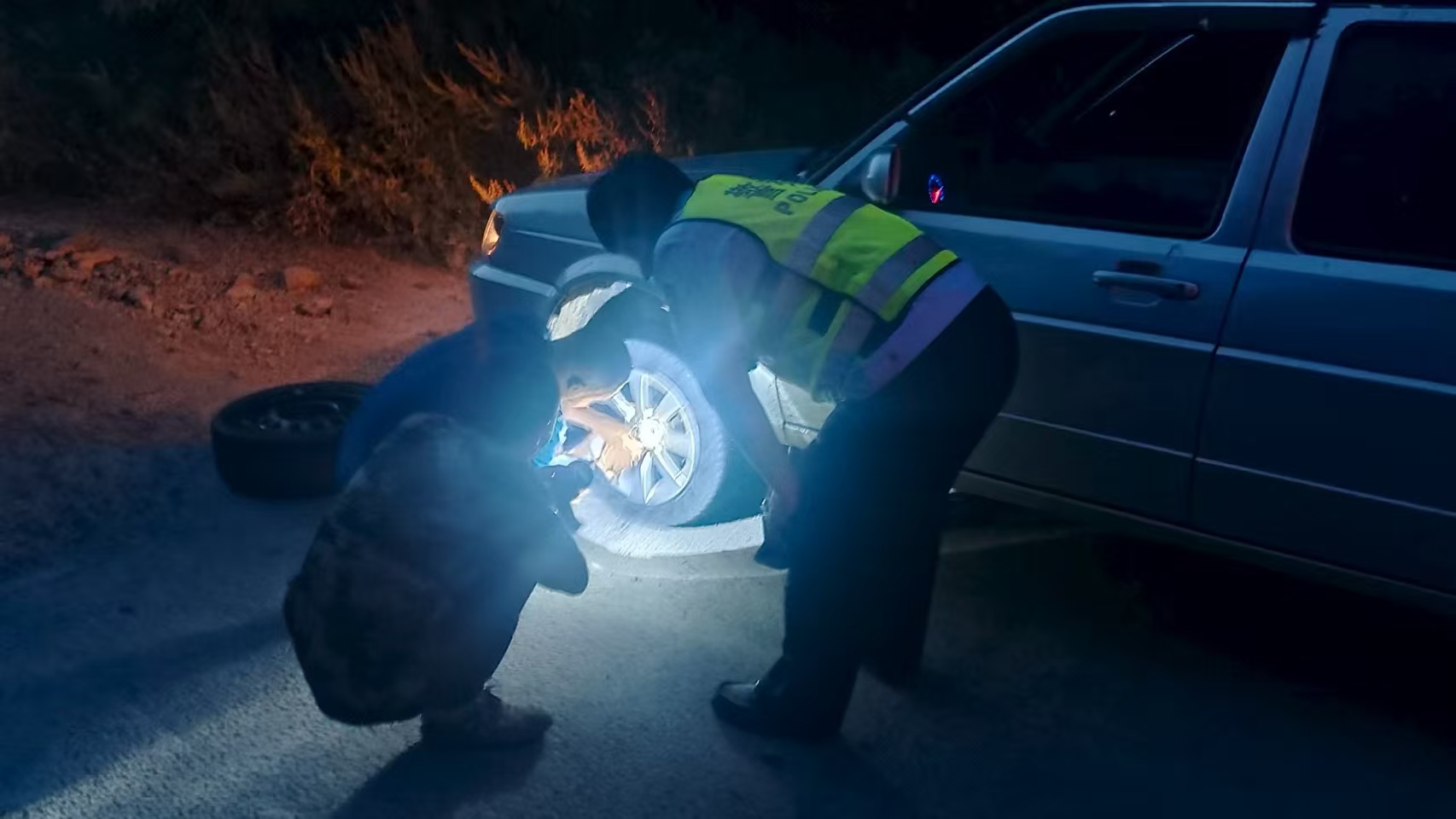 經詢問得知,駕駛員行車途中突然感覺車輛左側“向下一沉”,儀表盤隨即顯示左前輪胎壓不足。因地處虎豹公園周邊林區,天色昏暗且周邊無照明,駕駛員擔心下車查看時的安全,且未帶維修工具,只能硬著頭皮繼續行駛,直至被民警發現。“這里路段偏僻,繼續開車太危險!”為防止交通事故的發生,民警第一時間引導車主將車緩慢移至前方開闊安全區域,同時在來車方向擺放警示標志,提醒過往車輛減速避讓。隨后,民警從警車中取出便民服務箱中的工具,秒變“修理工”,挽起袖子迅速投入救援:拆卸輪胎螺絲、搬下沉重備胎、固定輪轂……一系列操作有條不紊地進行。