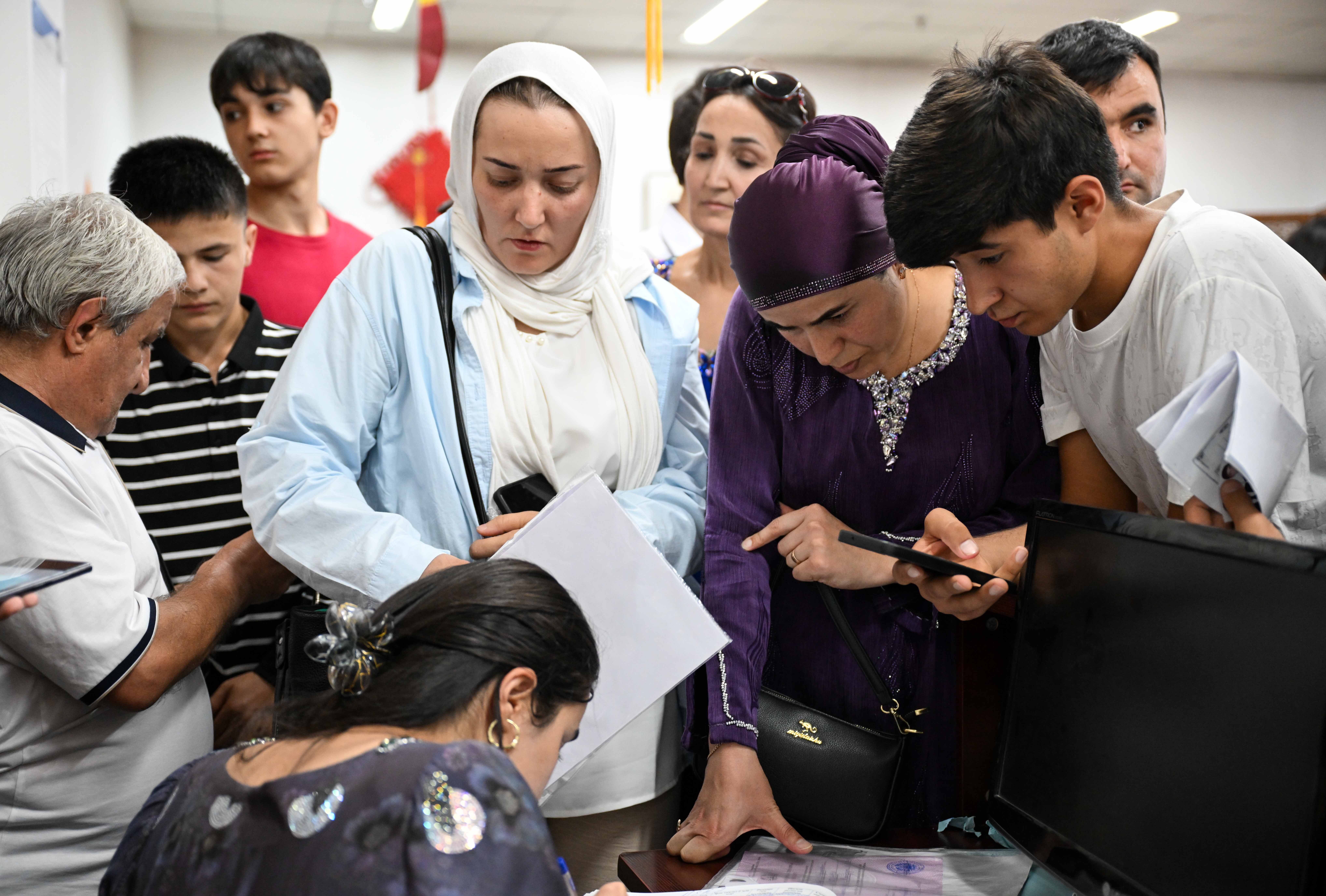 9月12日,在塔吉克斯坦首都杜尚別的國(guó)家圖書館中國(guó)廳,學(xué)生家長(zhǎng)在為孩子報(bào)名。
