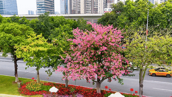 廣州,異木棉粉若云霞,與現代化的玻璃幕墻大廈、整齊的道路構成絕佳的城市風景。圖源:文明南沙