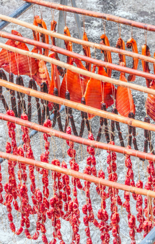 在秋風與暖陽中,臘味輕垂,鋪展出煙火氣滿滿的傳統晾曬圖景。圖源:東莞發布 李淦斌 攝